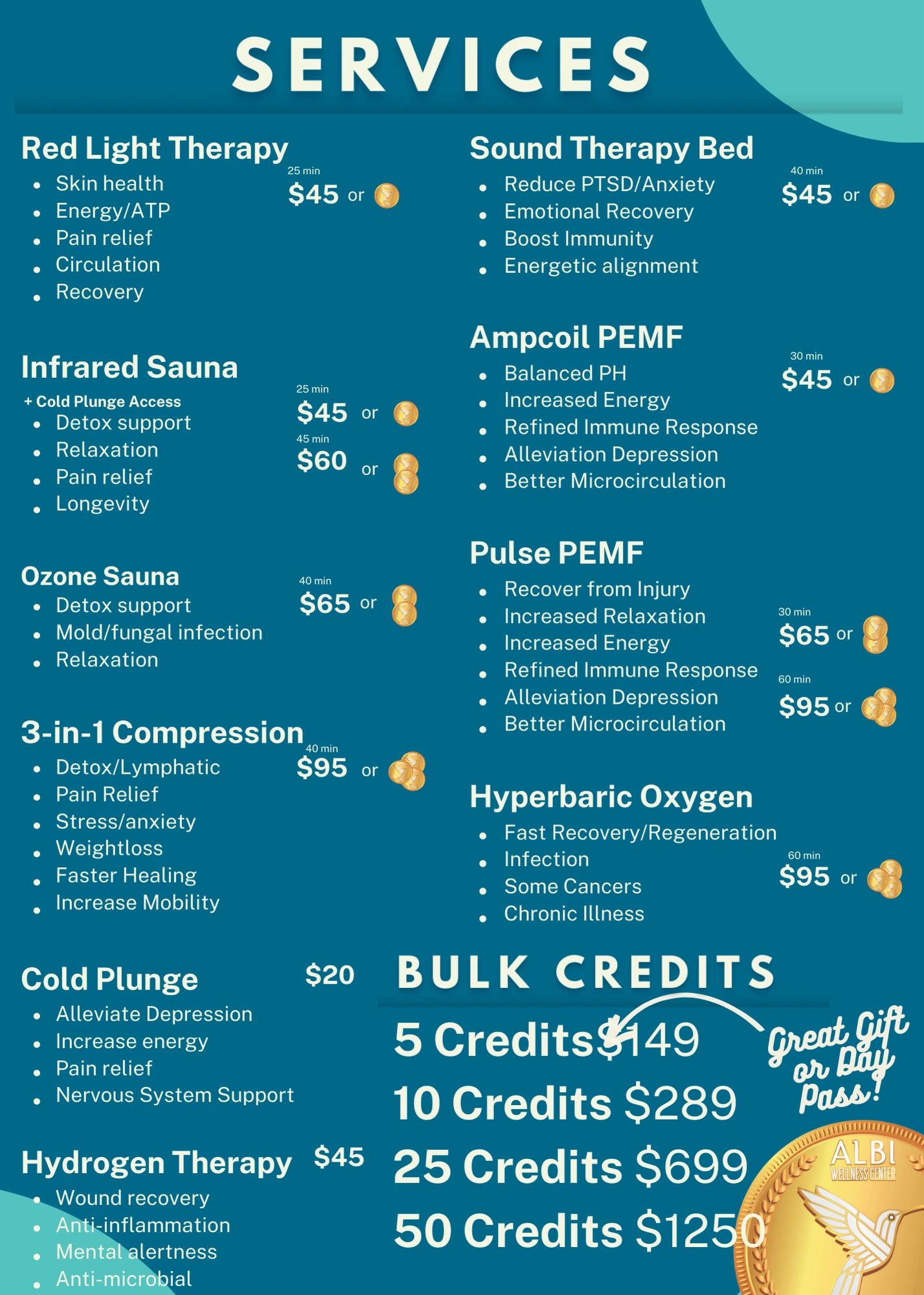 Members first access to our private events, gifts, discounts on products, discounts on additional credits, and access to our Recovery Room with some super secret therapies. ALBI Memberships require a three month commitment.